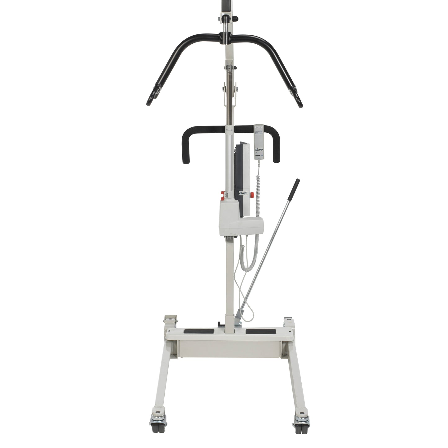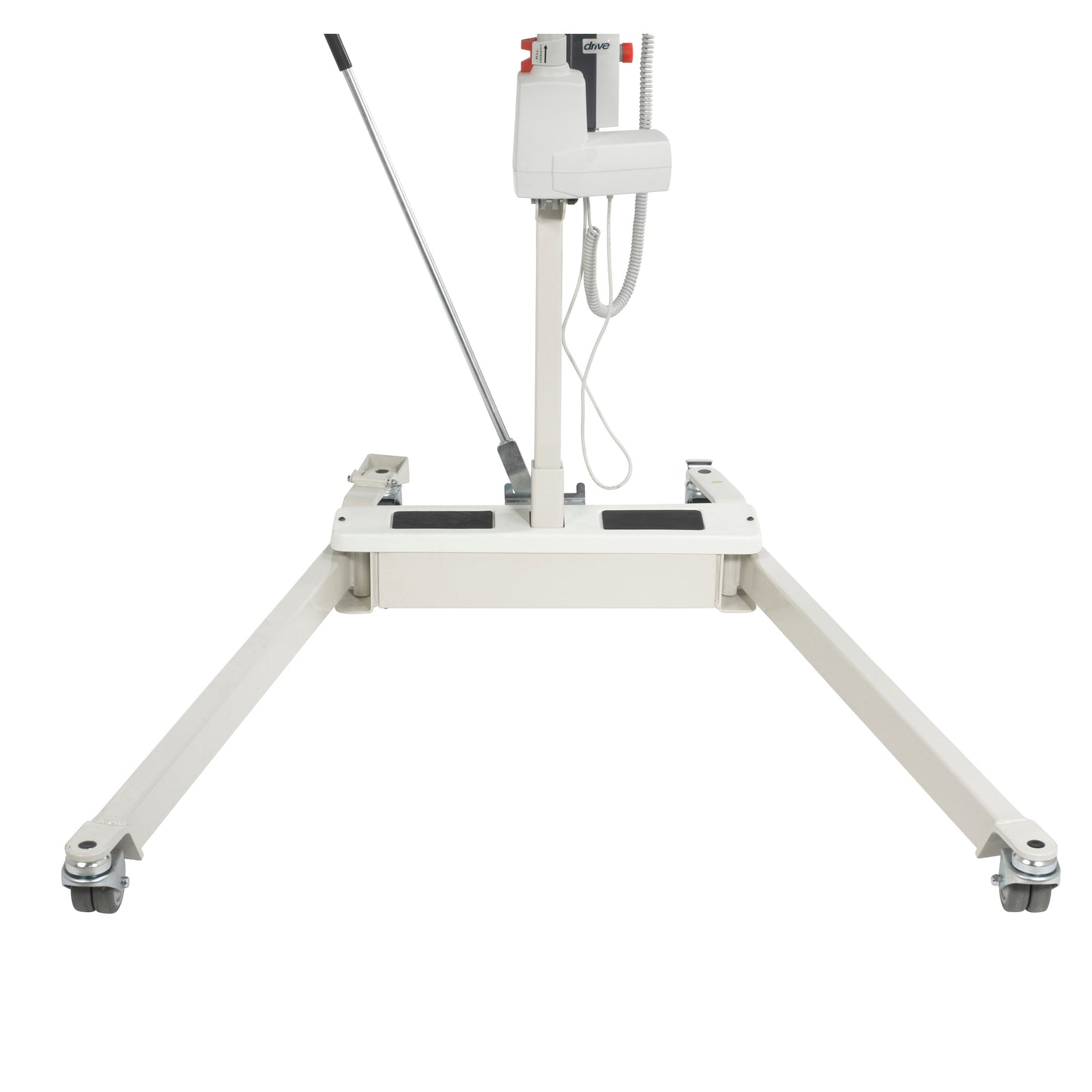 With a 600 pound weight capacity, this bariatric battery-powered lift with non-removable rechargeable battery by Drive Medical has strength on its side. The extra wide, coated cradle rotates 360 degrees and includes 4-point hook up. A high lift range allows the unit to transfer patients to high surfaces. The battery can be charged by plugging in the unit, and never needs to be removed (The lift will not operate while plugged in). A jumbo actuator pump that lowers the patient ensures safe repositioning. The pump even includes an emergency button and can be switched to manual mode. Sturdy base legs - with dual, 3" heavy duty front casters - adjust easily and lock securely into open position with padded shifter handles.