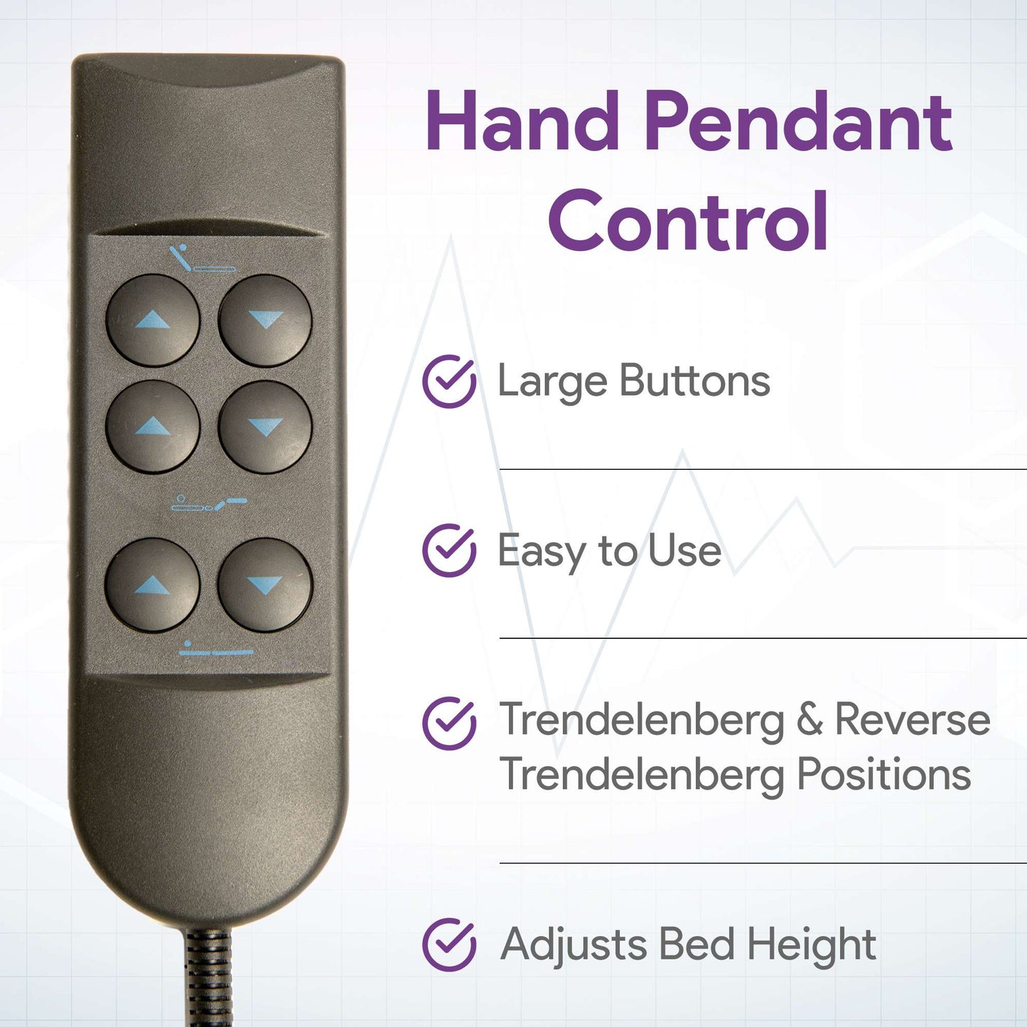 The easy to use hand pendant control has large buttons and the automatic hi-lo allows you to adjust the height of head and foot of the medical bed independently or simultaneously. Includes Trendelenberg & reverse Trendelenberg positioning.