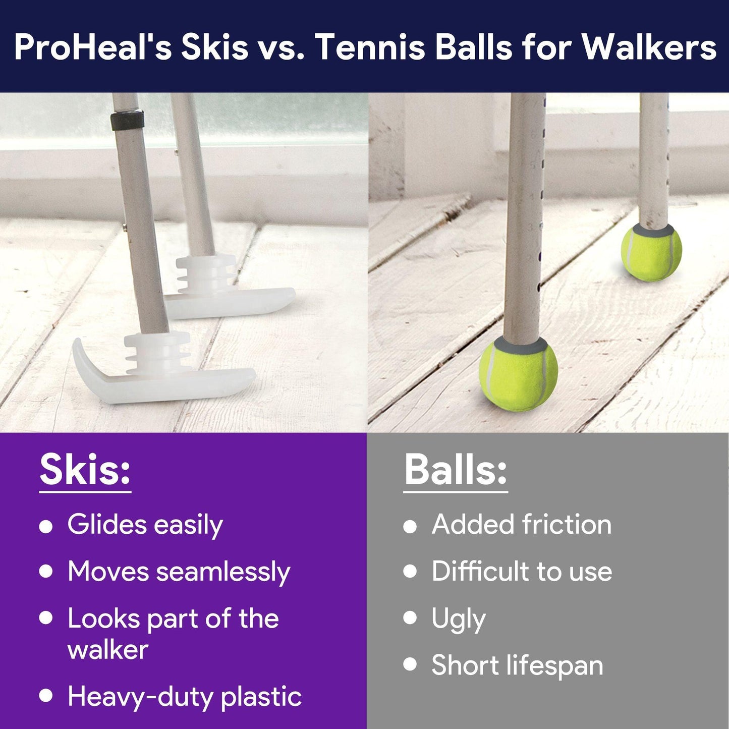 The preferred sliders for walkers, ProHeal's skis for walkers for seniors are simple to install. No tools are needed, slide them in, and your walker will move like never before.