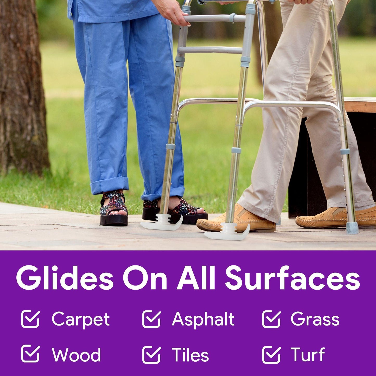 These versatile walker sliders slide over any indoor flooring material, like carpet, tiles, wood, and any outdoor surfaces, like grass, concrete, and asphalt. Their smooth design ensures zero scratches.