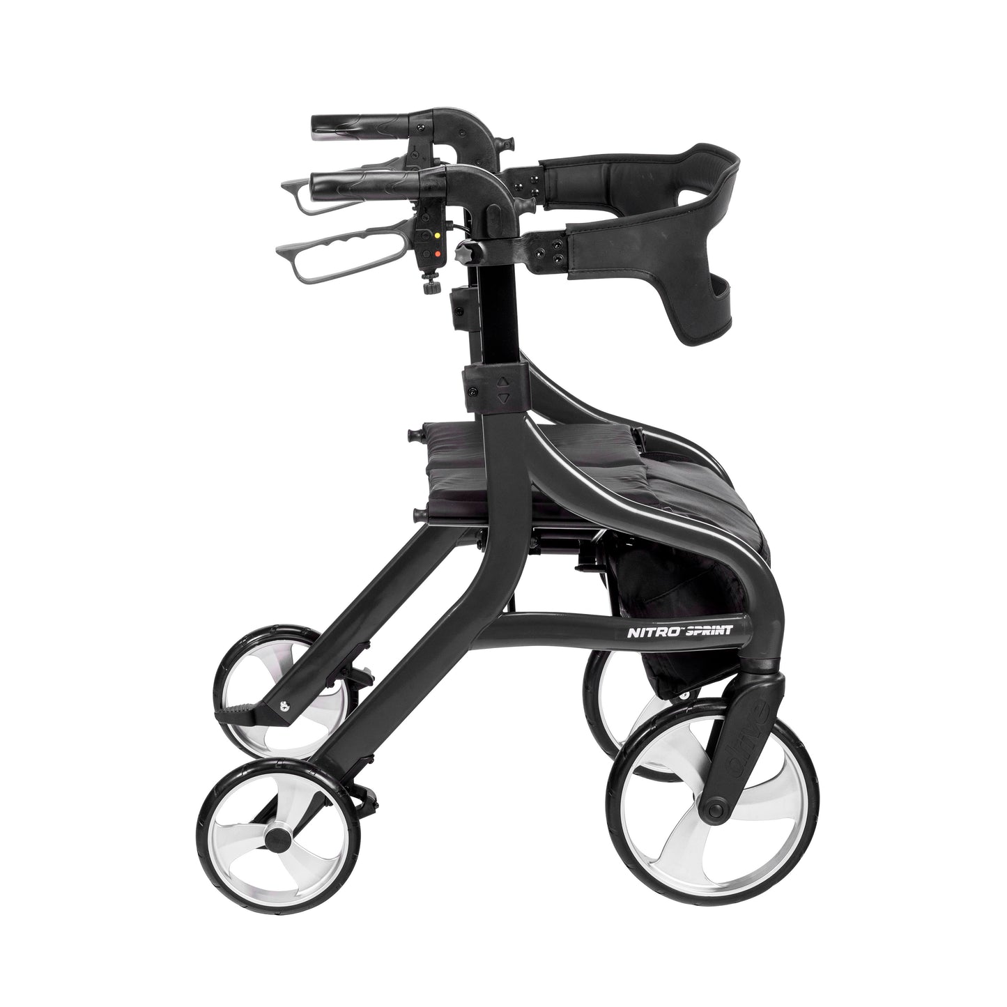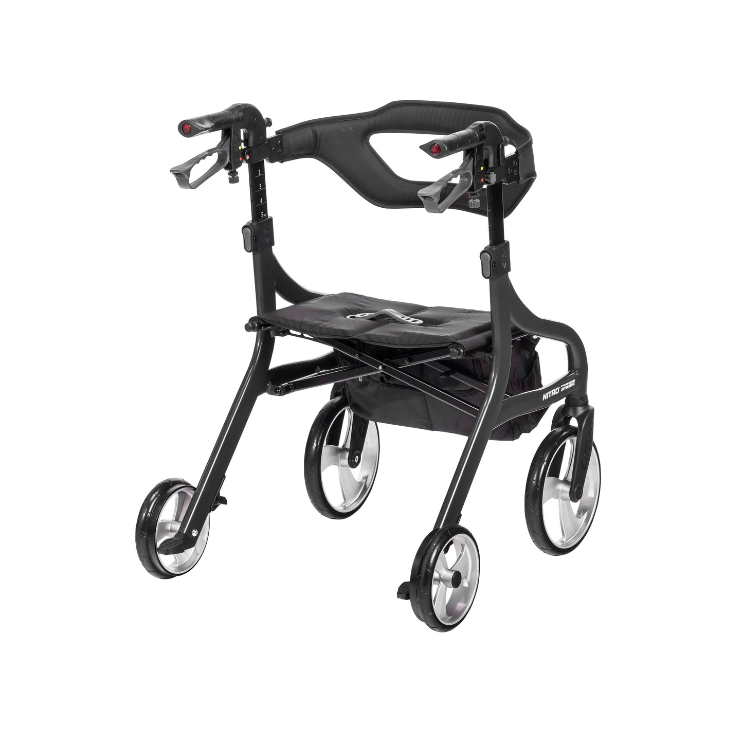 The sleek Nitro Sprint Rollator is designed to provide comfort, convenience and control at every turn. The rollator sports a unique braking system that reduces tire wear and an integrated slow-down brake for safer maneuverability over diverse terrain. When not in use, the rollator can be folded side to side with one hand and locked in place for easy transport. Other features include multiple storage bag mounting points and a wider backrest with a window for improved comfort and visibility.
