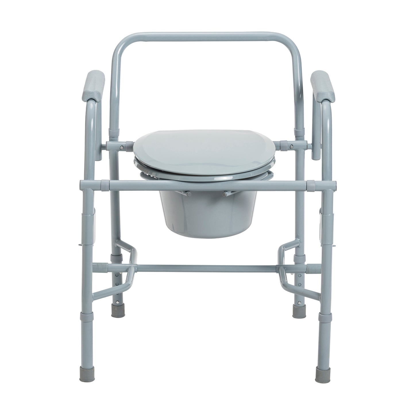 The deluxe steel drop arm bedside commode by Drive Medical is designed to meet your needs. The frame can be configured to be used as a bedside commode, toilet safety frame, elevated toilet seat or over your existing toilet. The tool free removable back makes configuring the commode easy for any application. The armrests provide a comfortable place to rest on when sitting and indicate a safe place to grab making sitting and standing easier. For consumers using a wheelchair the tool free drop arms makes lateral transfer to and from this commode easy and safe. The drop arms feature a large, easy to push release lever which is great for users with limited finger or hand dexterity. The push button height adjustable legs makes sizing a breeze allowing this commode to be used as an elevated toilet seat. In addition to comfort this commode can be disassembled with out tools making storage and travel convenient. The grey power coated steel welded construction ensures strength and durability able to hold up to 300 pounds. The product comes complete with a snap on seat and lid, 12-quart commode bucket with cover and convenient carry handle, plus splash guard.