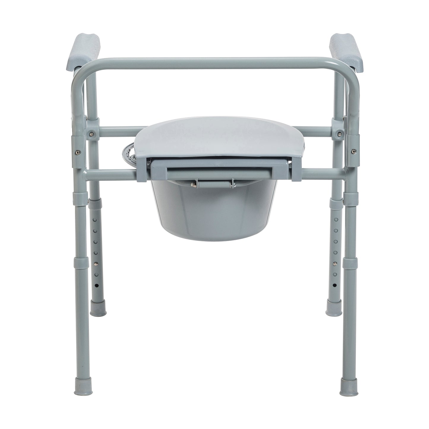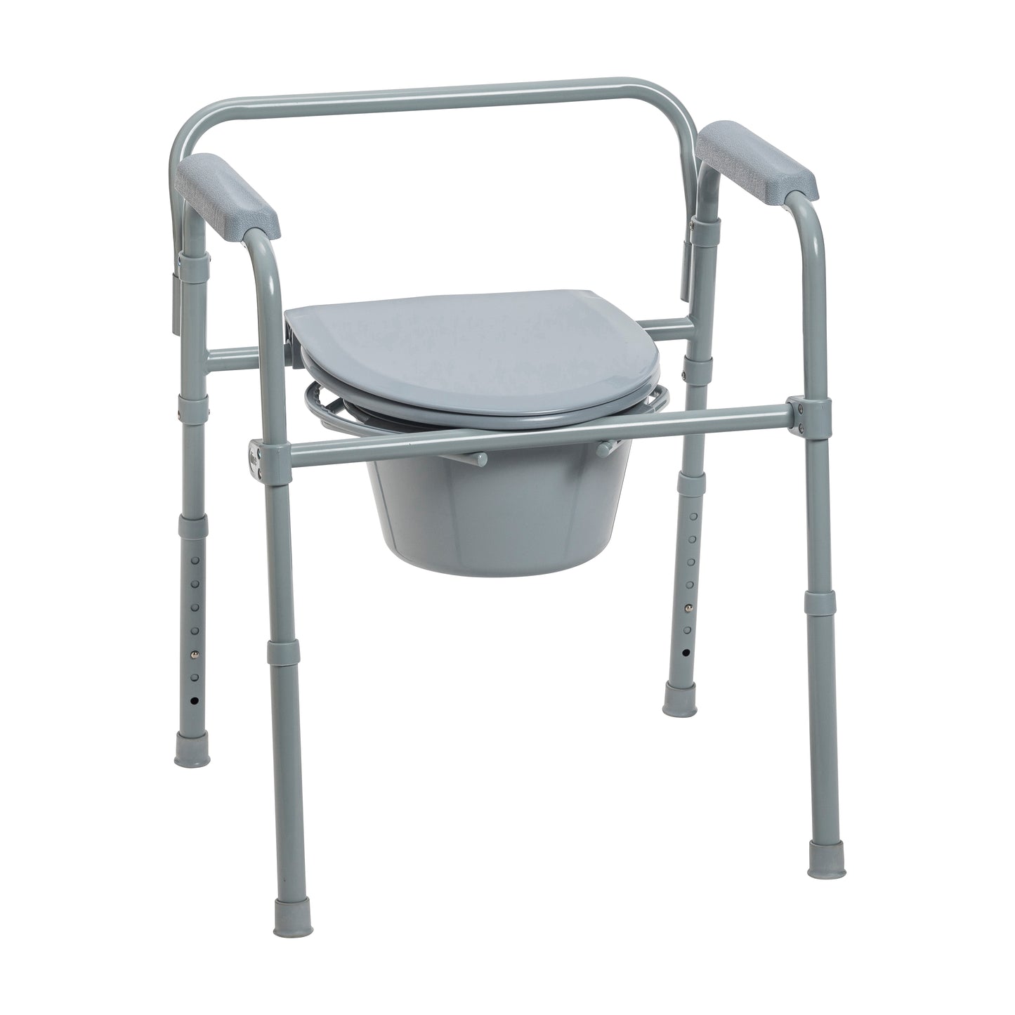 The Drive Medical Folding Steel Bedside Commode easily opens and folds, and will fold flat for convenient storage and transportation. The easy to use snap buttons allows this commode to open and fold in seconds. The durable plastic snap on seat and lid with the grey powder coated steel welded construction increase strength and durability. It comes with plastic arms for added comfort and safety. Comes complete with 7.5 qt commode bucket with carry handle, cover and splash shield.