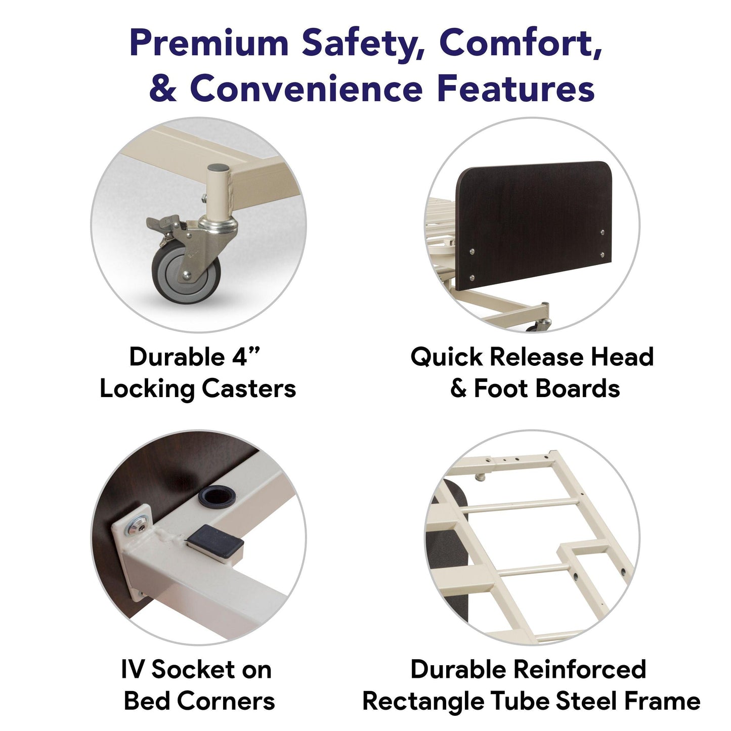 This fully electric motorized hospital bed has loads of great features, including the adjustable bed frame, 8 function hand pendant remote controller, quick-release head and foot boards, and corner mattress retainers.
